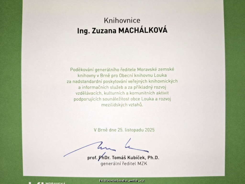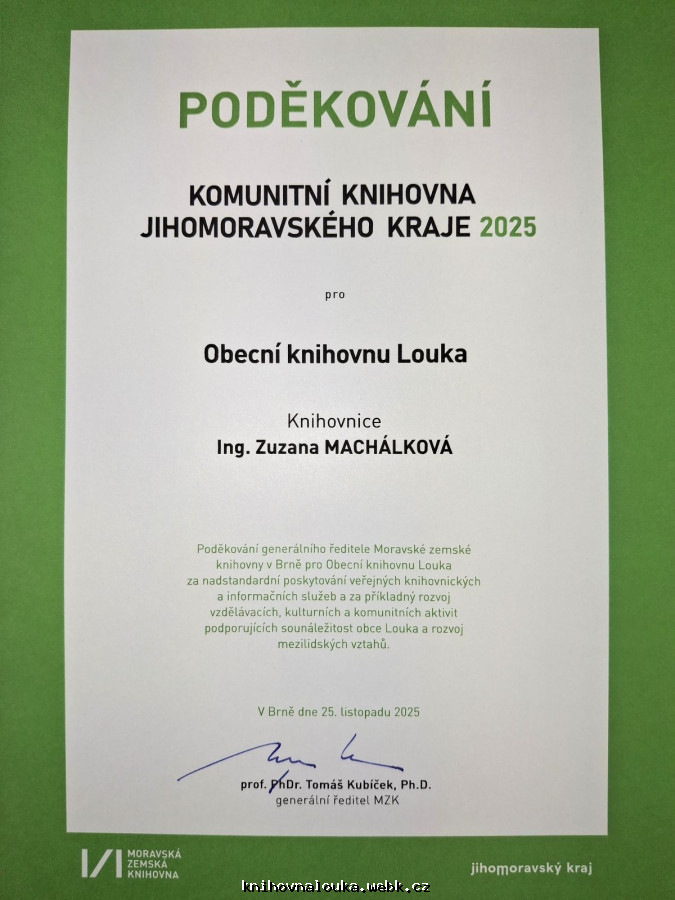 Knihovna se v roce 2025 přihlásila do soutěže o komunitní knihovnu jihomoravského kraje. V říjnu naší knihovnu navštívila hodnotící komise, která hodnotila jednak vzhled a vybavení knihovny, ale hlavně propojení knihovny do komunitního života obce. Knihovnice si proto nachystala prezentaci, ve které představila veškeré aktivity, které v knihovně probíhají. Slavnostní vyhodnocení soutěže se konalo 25. listopadu v Brně v zastupitelském sálu Krajského úřadu. Úvodní slovo pronesl hejtman Jihomoravského kraje Mgr. Jan Grolich, který zdůraznil důležitost knihoven jako vzdělávacích a kulturních center obcí. Celkovým vítězem se stala knihovna v Ratíškovicích, ale ani naše knihovna se neztratila v konkurenci, byla vyzdvižena za práci s dětmi a patří mezi 17 nejlepších knihoven Jihomoravského kraje v pořádání komunitních, vzdělávacích a kulturních aktivit. Toto ohodnocení nás velmi potěšilo a ve svých bohatých aktivitách bude knihovna i nadále pokračovat.